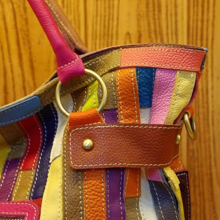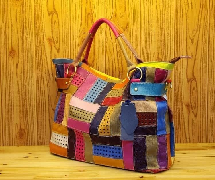 Linda Bolsa feminina de couro Patchwork Exclusividade aqui na loja para você..Bolsa Patchwork Couro é confeccionada em couro genuíno de vaca. Possui 2 alças de ombro/mão, interior em tecido colorido, um bolso interno com zíper, fechamento por encaixe de pino de madeira. Bolsa possui detalhes de ilhóses por toda a bolsa. Compre bolsas de couro genuíno na passabela