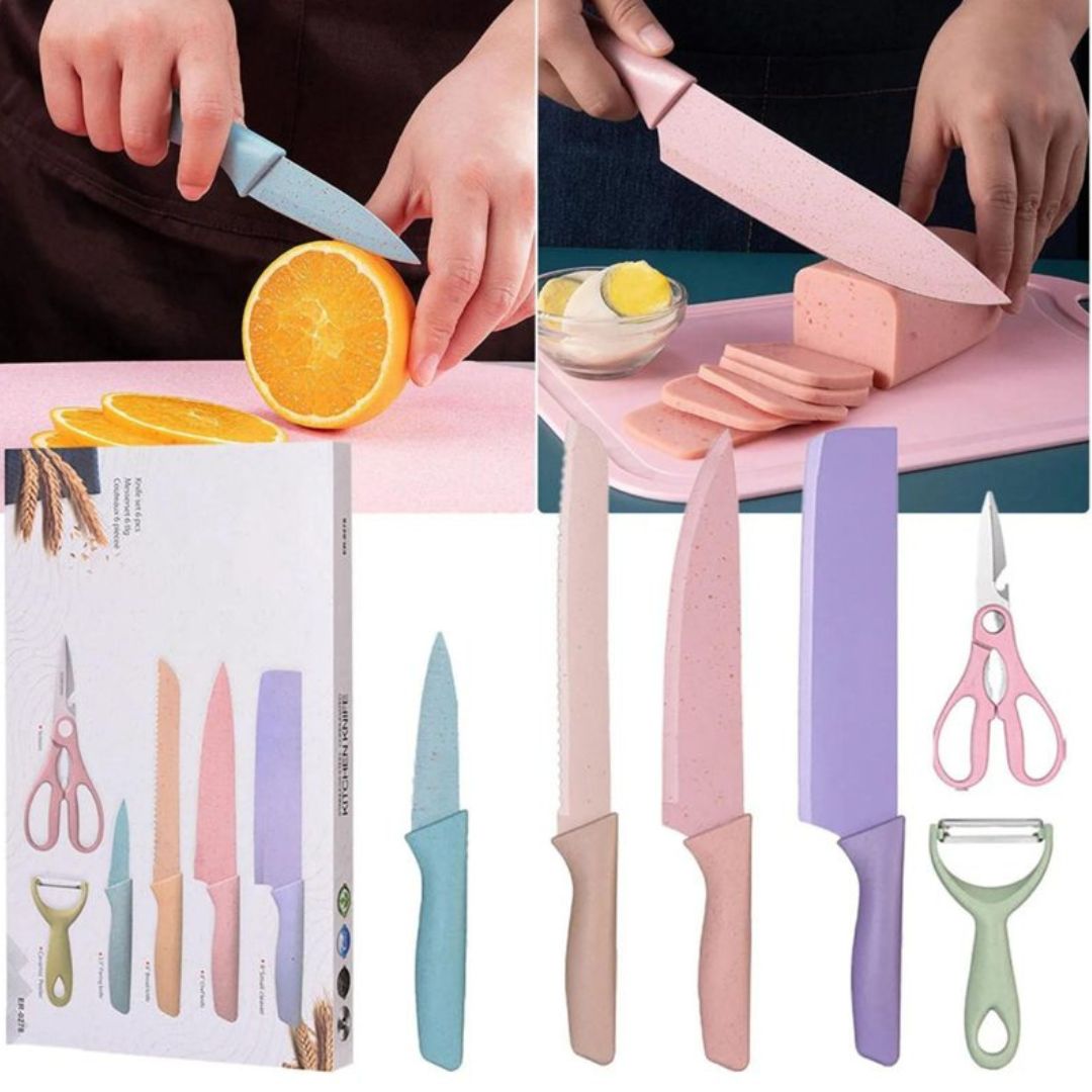Kit de Facas Inox Coloridas com Tesoura e Descascador – 6 Peças Essenciais para Sua Cozinha